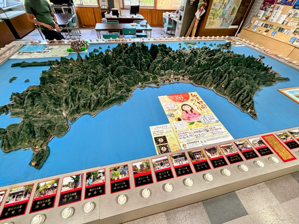 途中、前山ダムのすぐそばにある「お遍路交流サロン」に立ち寄った。ここは歩き遍路の歴史や資料が展示されている施設で、お遍路の成り立ちや文化を深く学ぶことができる。