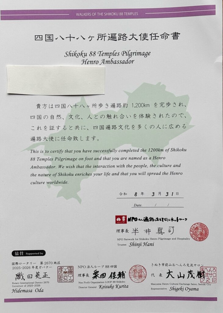 さらに、申請すると「四国八十八ヶ所歩き遍路大使」の任命書とバッジをもらうことができる。これまでの道のりが形として認められたような気がして、実際にもらうと嬉しかった。