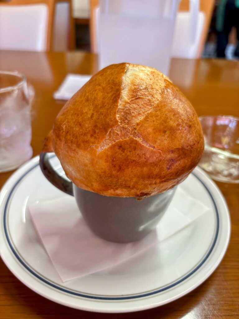 上のパンを潰して食べると、熱々のクリームシチューのような感じで、エビもプリプリしていて美味しかった。