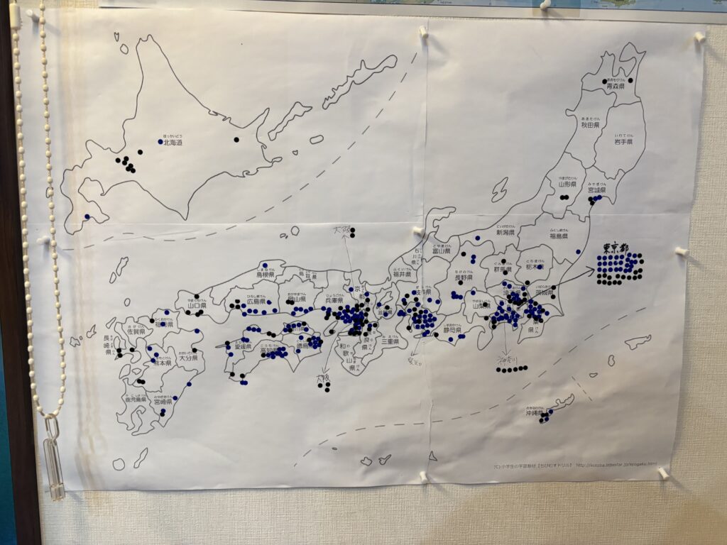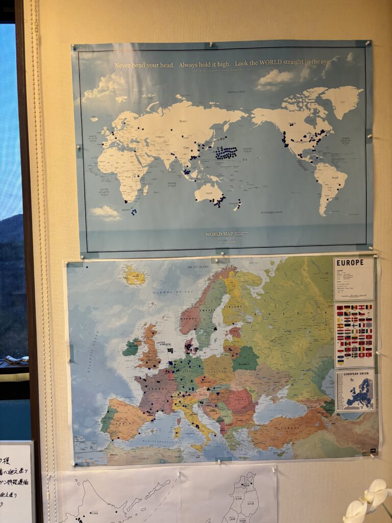 出発前の儀式として、女将さんと一緒に写真を撮る。そして、リビングの壁にある世界地図に「どこから来たか」を示すシールを貼らせてもらった。まだオープンして1年半とのことだが、すでに世界各国からのシールが貼られている。ただ、イスラム圏からの訪問はほぼ無いというのが視覚的にわかりやすくて面白かった。非常に温かい宿だった。