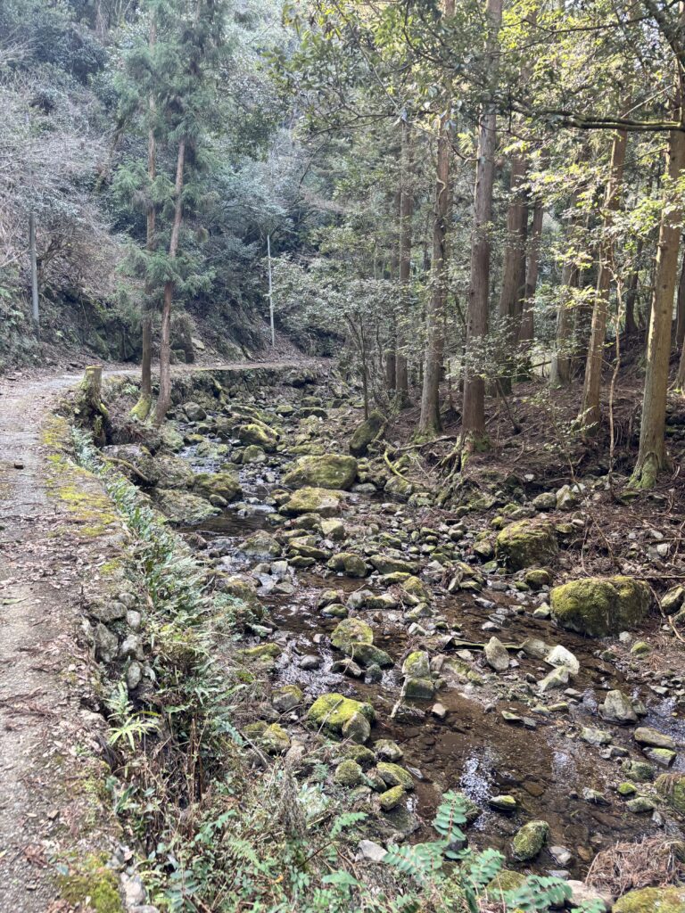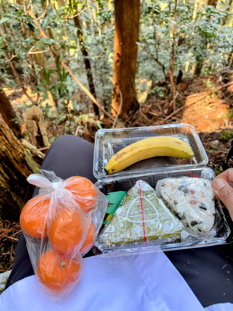 お腹が減りすぎたので、杉林の中の日当たりの良いところで昼ごはんにした。宿で持たせてくれたおにぎり2個とバナナ、そしてみかんをいただく。みかんは西日本では小さい方が好まれるようだが、関東では大きいものが好まれる傾向にあるという話を聞いた。