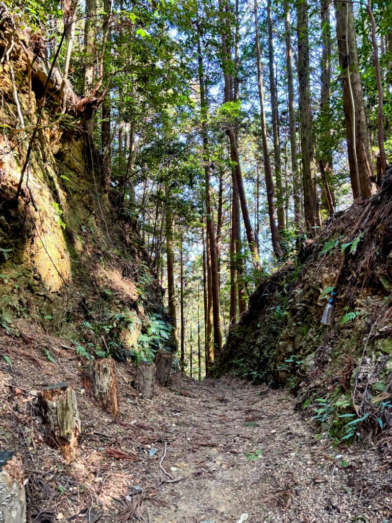 太龍寺から下りの山道に入るが、なかなか標高が下がらない。水平な山道を数キロ歩く。