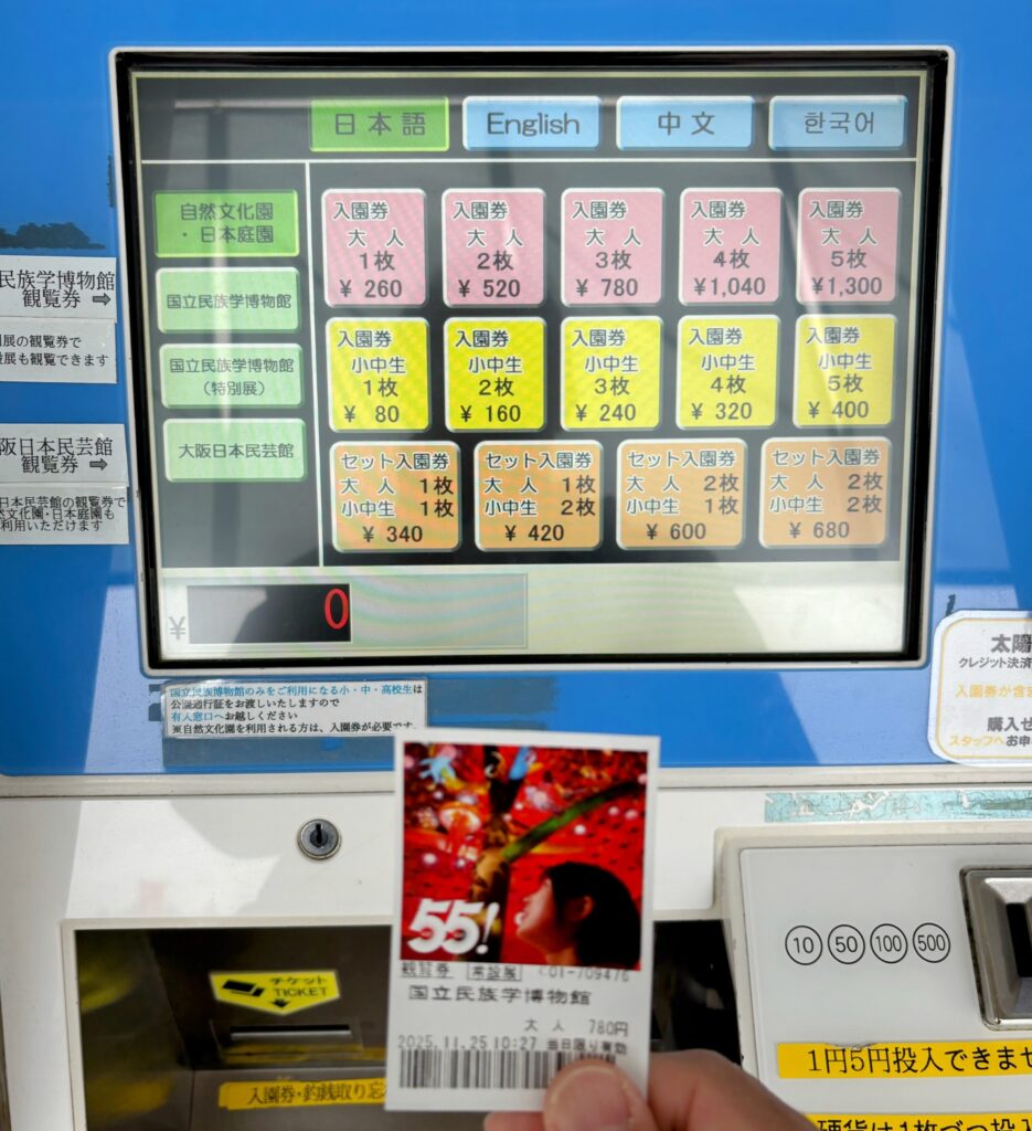 万博公園の入園券と国立民族学博物館のチケットがセットで購入可能。最近は何でも千円を超える時代、一般展示の価格は780円とお得な設定。