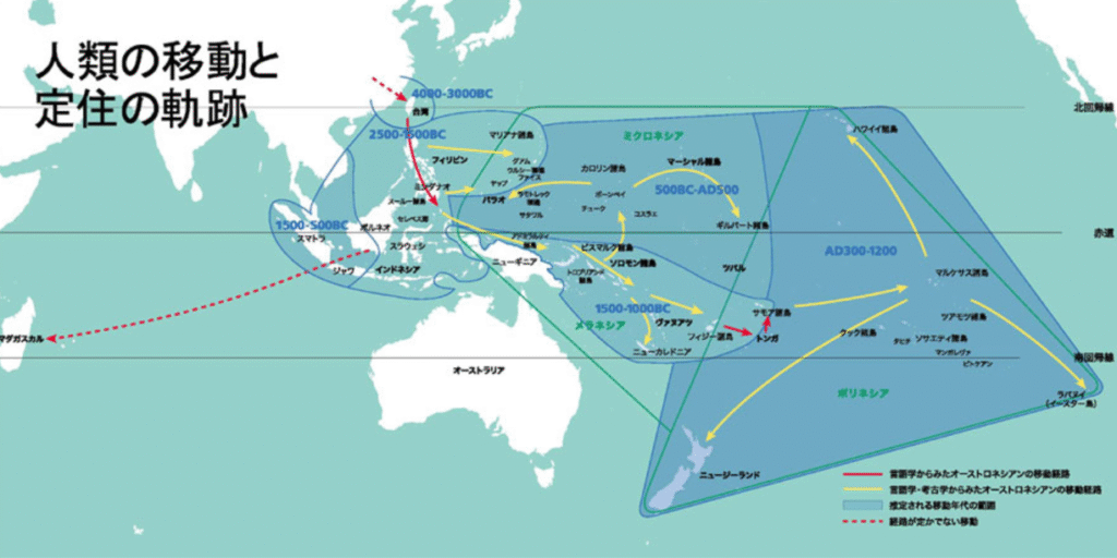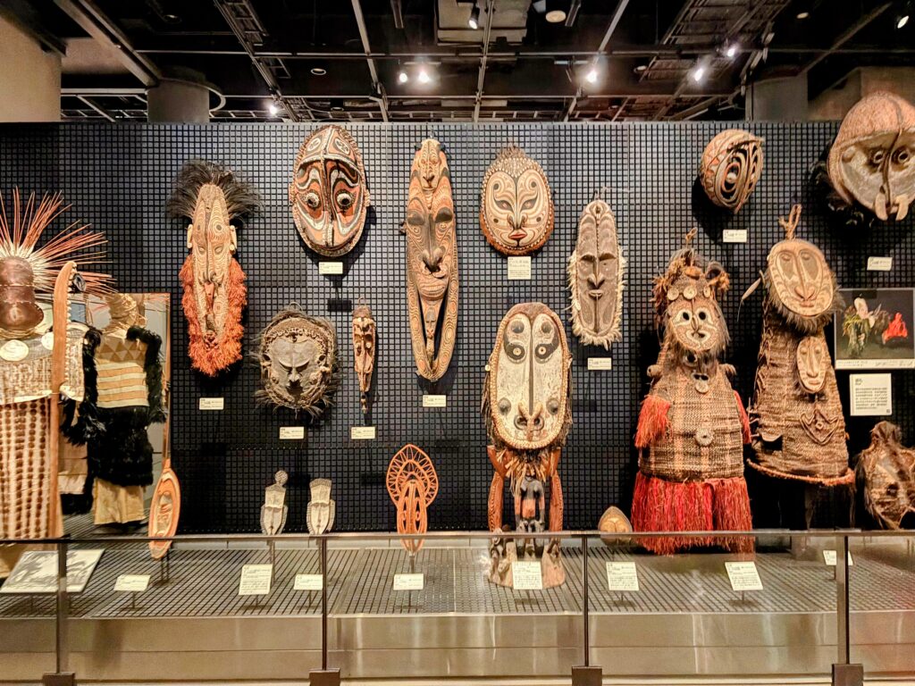 最初はオセアニアには興味をないかなと思っていたが、展示を見始めると、色々な民族がいて、興味深い。エリアもミクロネシア、メラネシア、ポリネシアと分類されている。日本列島に人類が渡ってきたのは約4万年前。一方、このエリアには紀元前1500年前に東南アジアから人々が移住してきた。歴史は短いけれど、島々の環境に合わせて独自の文化を形成していったことがわかった。