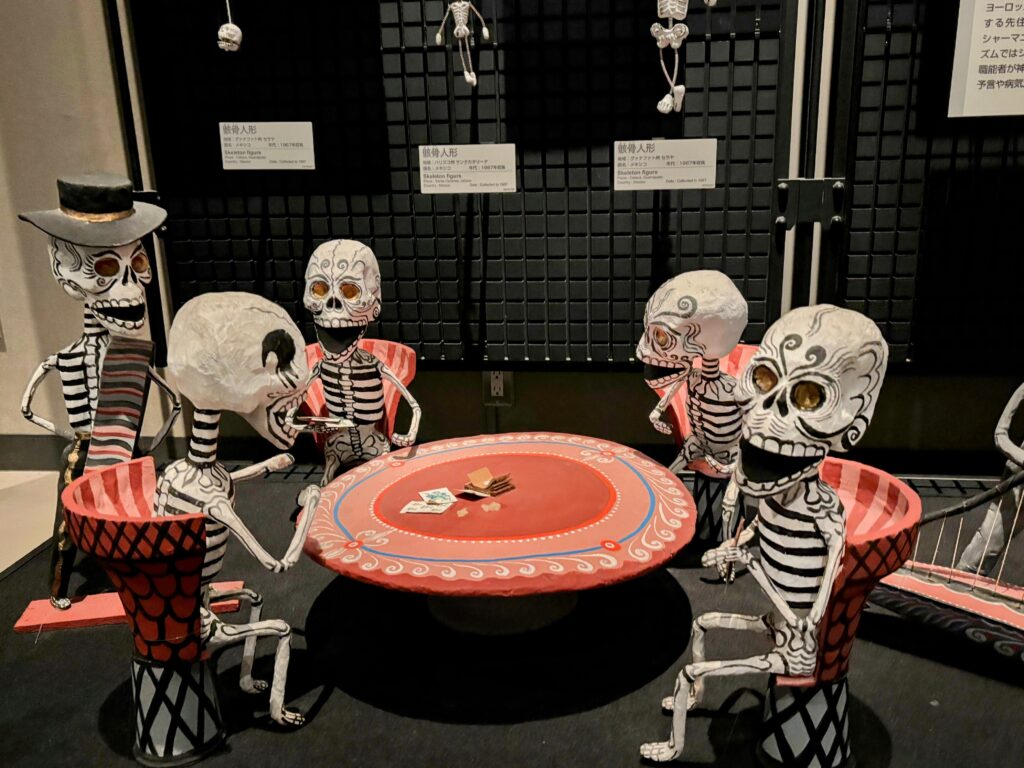 メキシコのガイコツ君たちの展示。メキシコでは、11月2日はカトリック教会の死者の日である。人びとは墓に花を供え、ロウンクを灯して、死者との霊的な交流を図る。メキシコでは特にガイコツ人形が作られ、死を身近なものにしている。