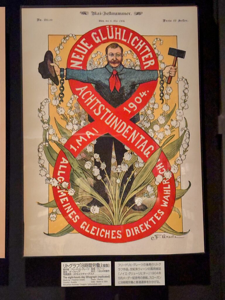 民族の取り扱う範囲は幅広い。このポスターはヨーロッパで8時間労働を掲げたものである。100年くらい前のものから現在のものまでの展示の範囲は広い。