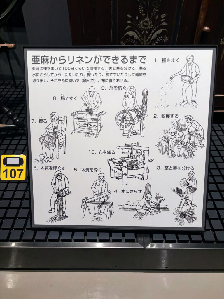 東南アジアエリアでは、ベトナムのモン族の村で見た麻から布を作る工程を説明してくれている。ベトナムでは9番の糸を紡ぐ工程と10番の布を織る工程を見ることができたが、このパネルの説明で全ての工程を理解できた。