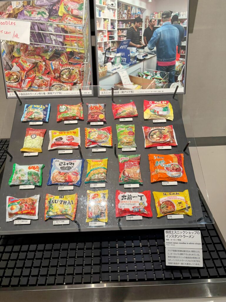 現在のものの展示例として、インスタントラーメンも展示されている。これらはアジアでなく、ヨーロッパで売られているものである。移民の増加に伴って、エスニック食品店が増えて、様々な地域のインスタントラーメンが普及しつつあることがわかる。