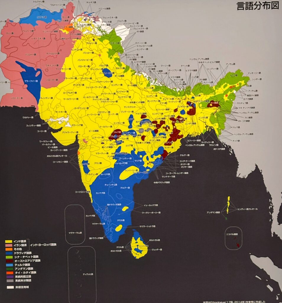インドエリアの言語分布図。見た目が日本人い近いシナ・チベット語族やオーストロアジア語族に興味があり、行ってみたくなるところが増えてしまう。
