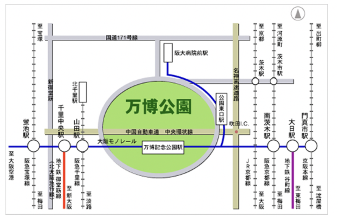 新大阪駅からは地下鉄御堂筋線(北大阪急行線)の千里中央駅で下車。大阪モノレールで2駅で万博記念公園駅に着く。そこから15分くらい歩く必要がある。