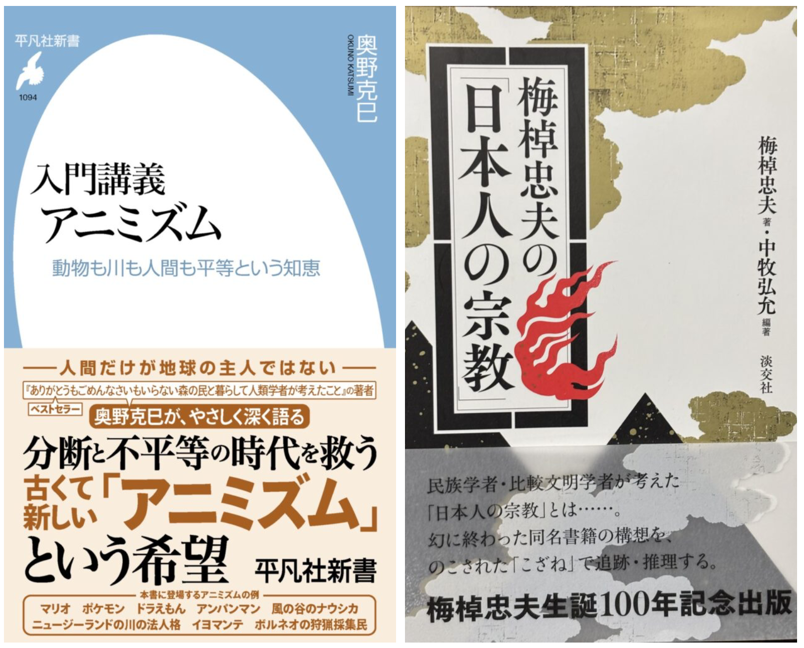 文化人類学者・奥野克巳先生の『入門講義 アニミズム 動物も川も人間も平等という知恵』と、知の巨人・梅棹忠夫先生の『日本人の宗教』です。