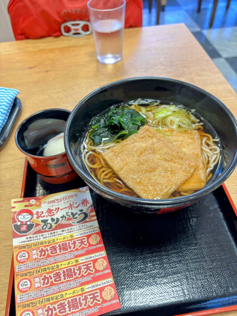 ハイキングの朝は、定例となっている新松田駅前の「箱根そば」での朝食からスタートします。前回いただいた60周年記念のクーポンをちゃっかり活用して、温泉たまごをゲット。腹ごしらえを済ませると、なんと再び新しいクーポンを頂いてしまいました。これでまた次回の山行時の朝食も決まりです。