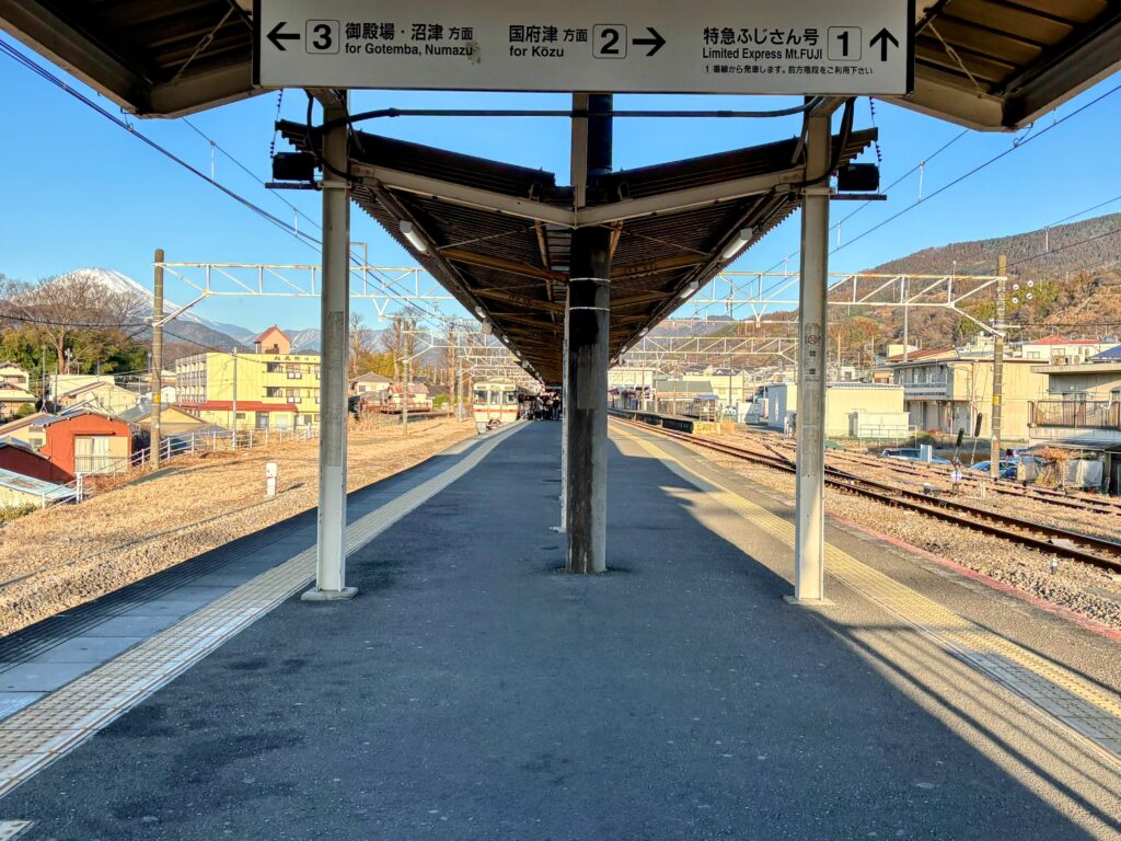 松田駅のホームで電車を待っていると、階段からずいぶん離れた場所に電車が停車。いつも「遠いな」と思うのですが、ホームからすでに雪を被った美しい富士山がくっきりと見えており、テンションが上がります。