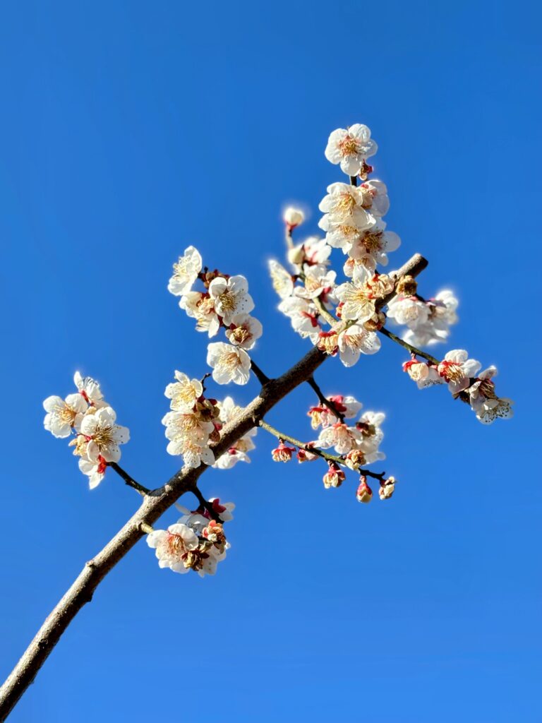 坂を登っていくと、周囲の景色は一気にのどかな丘陵地帯へと変化します。おおいゆめの里に近づいてくると、道沿いに可愛らしい白い梅が咲いているのを見つけました 。こちらはまだ2〜3分咲き程度で、本格的な見頃はもう少し先のようです 。ということは、これからもしばらく花見を楽しめるということです。