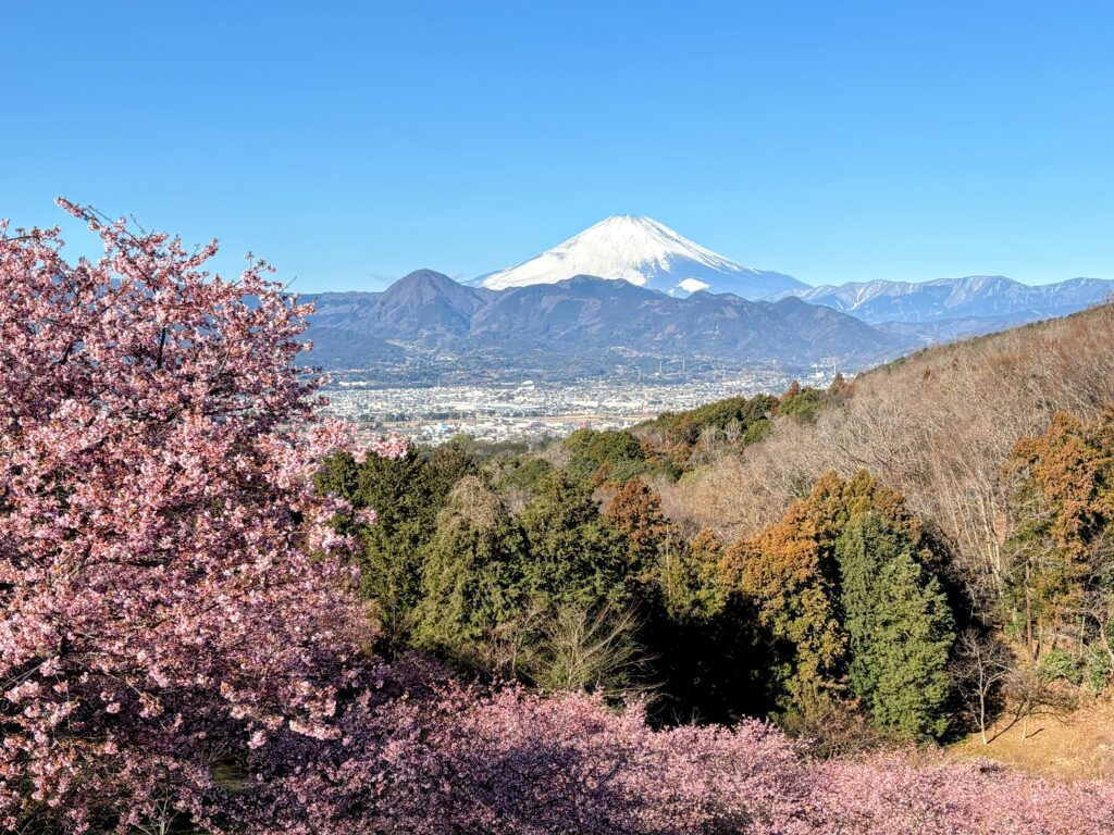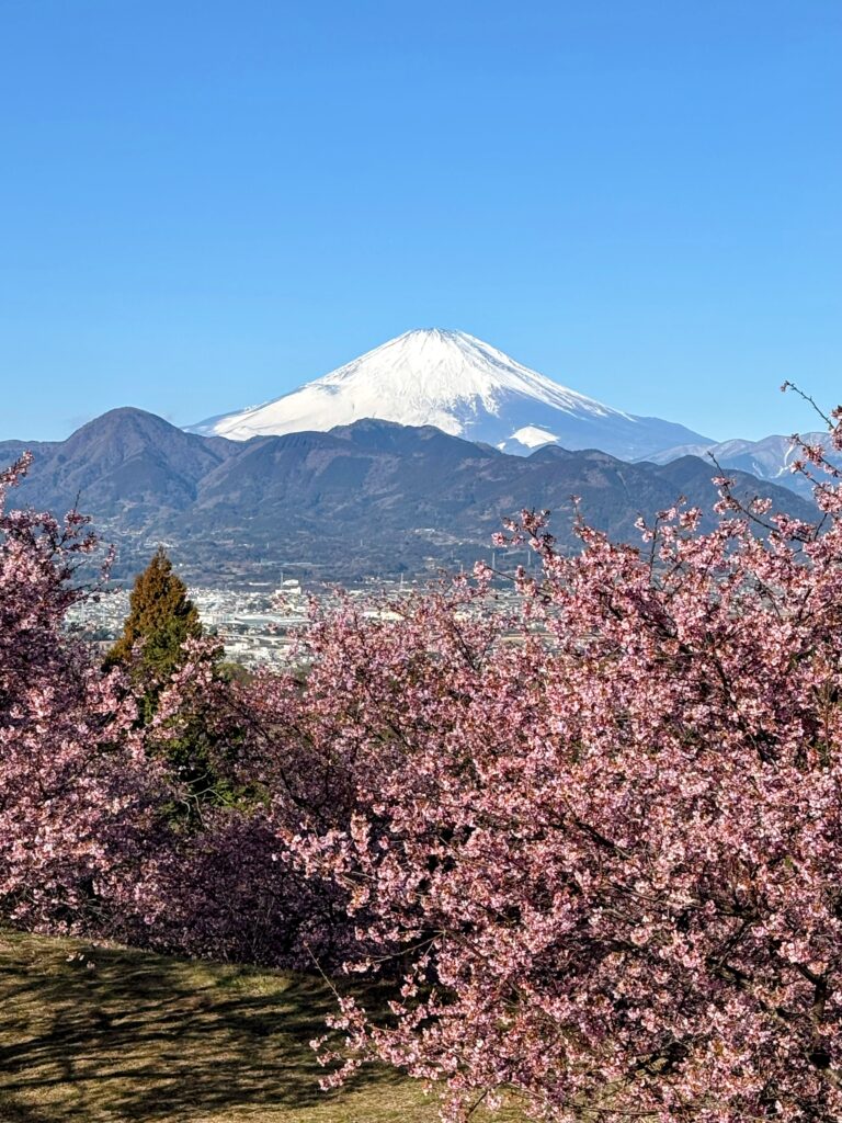 そして何より素晴らしいのが、桜のトンネルの向こうにそびえ立つ富士山の圧倒的な存在感。ピンク色の河津桜と、真っ白な雪を冠した富士山、そして抜けるような青空。「桜と富士山というのは絵になりすぎる」と心の中でつぶやいてしまいました 。本当に、こんな素敵な富士山と桜の絶景ポイントがあったとは、今まで知らなかったのがもったいないくらいです。