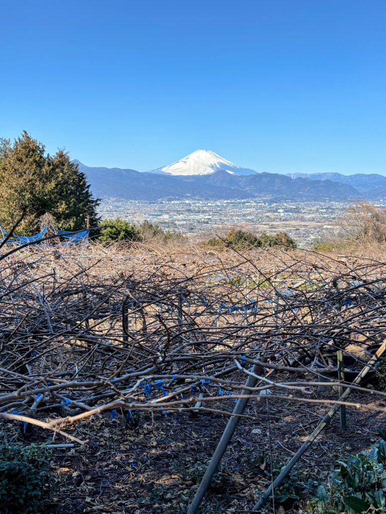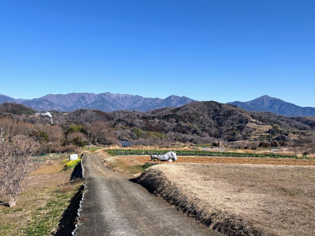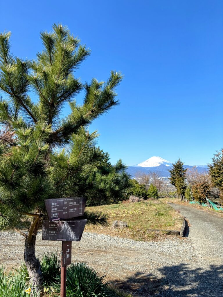 歩きながらしみじみと思ったのは、「富士山というのは反則だ」ということ 。なんでもない果樹園の風景や、枯れ草の広がるただの空き地であっても、その後ろに雄大な富士山がくっきりと写り込むだけで、すべてが一瞬にして「絶景」に変わってしまうのです。そんな絶景がどこに隠れているのか探しながらゆっくり歩を進めるのは、低山ハイクならではの楽しい時間の使い方です。