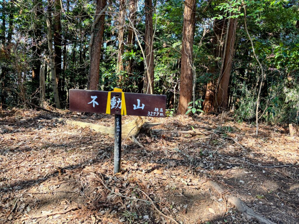 景色を堪能した後は、曽我丘陵の最高地点である標高328mの「不動山」へ向かいます。山頂に到着しましたが、周囲は樹木に囲まれており、不動山からの眺望はありません 。
