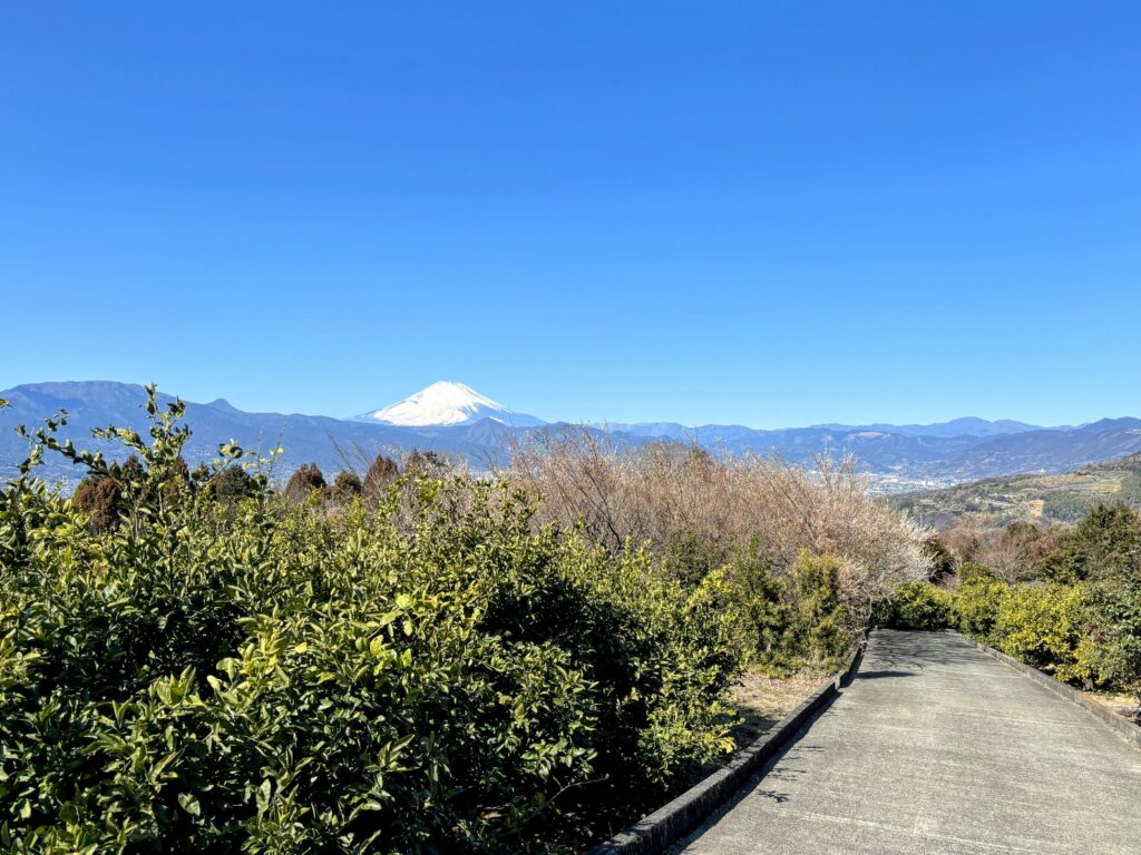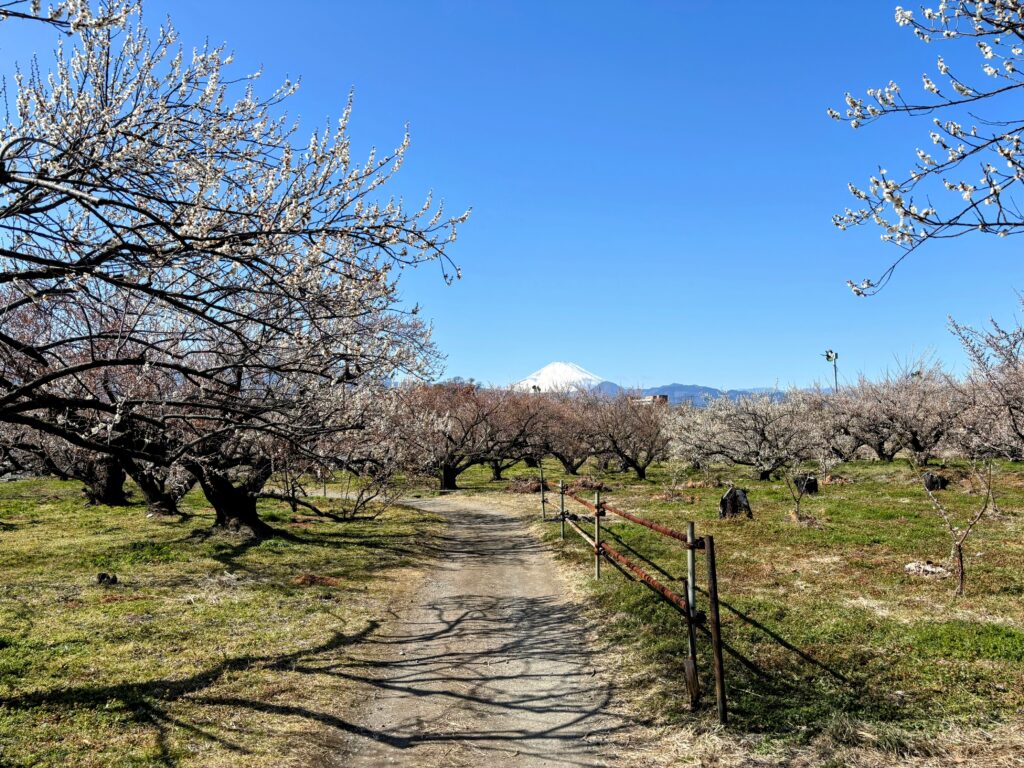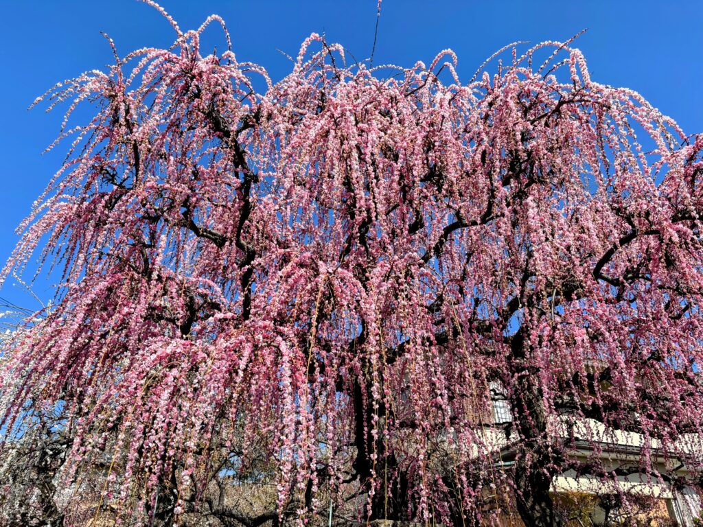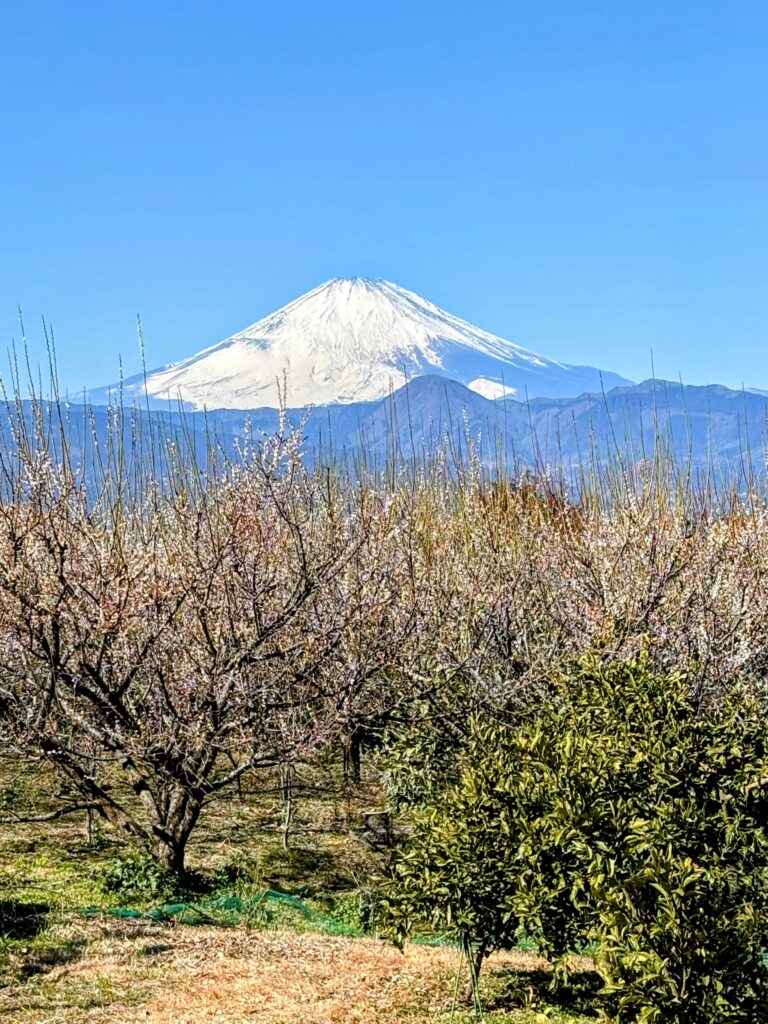 お目当ての白梅のエリアは、まだ2〜3分咲きといったところで全体的な見頃には少し早かったのですが 、案内所で教えてもらった一般の家にある「枝垂れ梅(しだれうめ)」がまさに満開 ! 濃いピンク色の滝のように咲き誇るその姿は、この日見た梅の中で一番大きく、息を呑むほどの綺麗さでした 。梅林越しに見る富士山など 、和の心を感じる風景をたっぷりと堪能しました。
