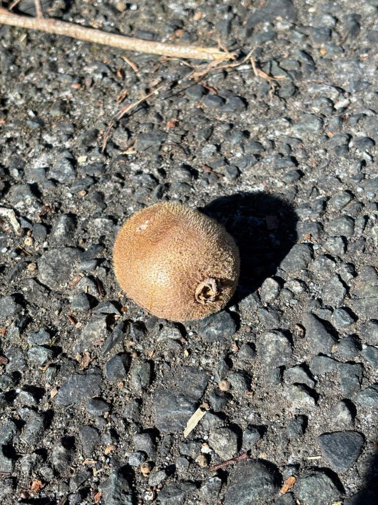 海を眺めた後は、ミカン畑やキウイ畑が続く、のどかな農道や山道へと入っていきます。道路にはキウイがコロンと落ちていて、見上げると横は立派なキウイ畑でした。