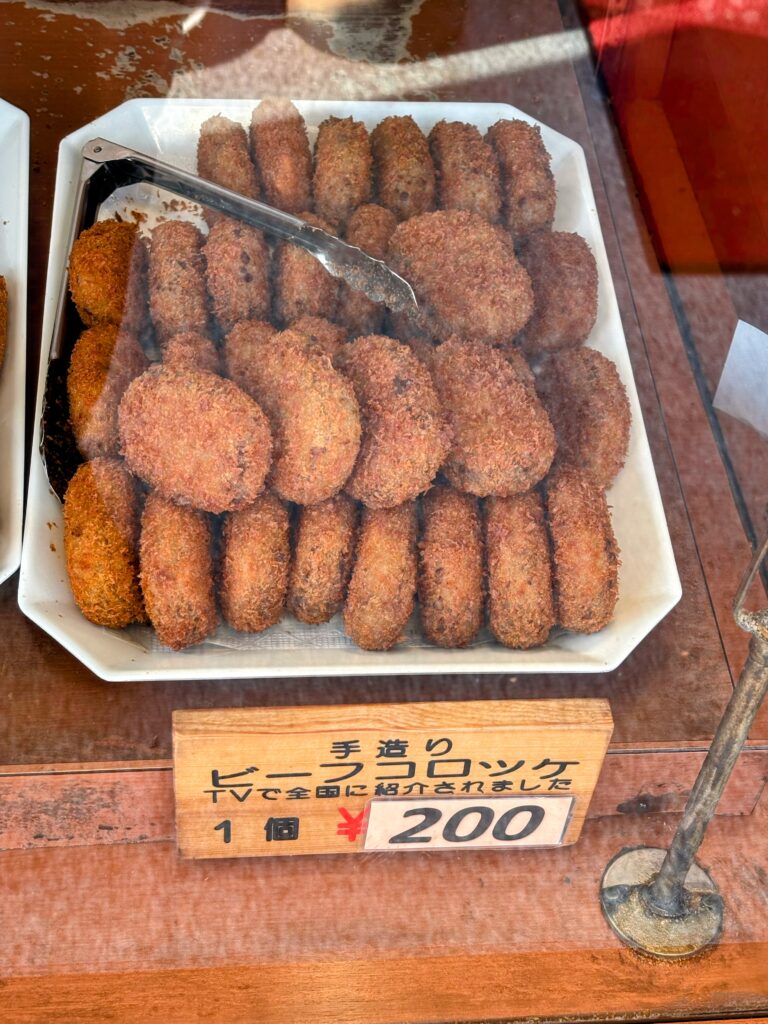 松江城へ向かう途中、「ミートショップきたがき」で手作りビーフコロッケを買って、店先で食べる。しまね和牛を使ったコロッケで地元で人気のようである。揚げたてのコロッケは美味しい。粘度のあるじゃがいもで、中はねっとり系。少し味わいの違うコロッケ。一つで物足りなかったので、隣にあったミンチカツを買っても良かったかもしれない。