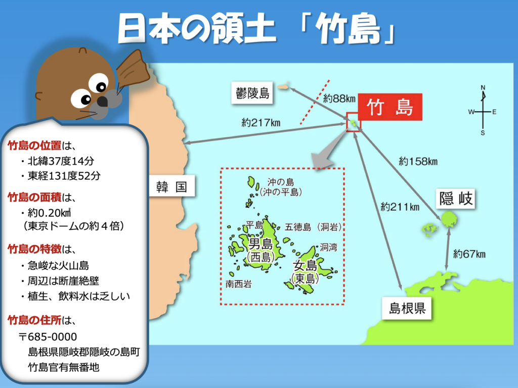 竹島が日本の領土であることを知ってもらうために、島根県が作った資料室である。日本の領土なのに行けない竹島。韓国と見解の違いで、現在は武装した要員を置いて竹島の不法占拠を続けている。平和的に解決するために島根県は取り組んでいる。その現状を正しく知ってもらうために島根県庁の一部に竹島資料室がある。