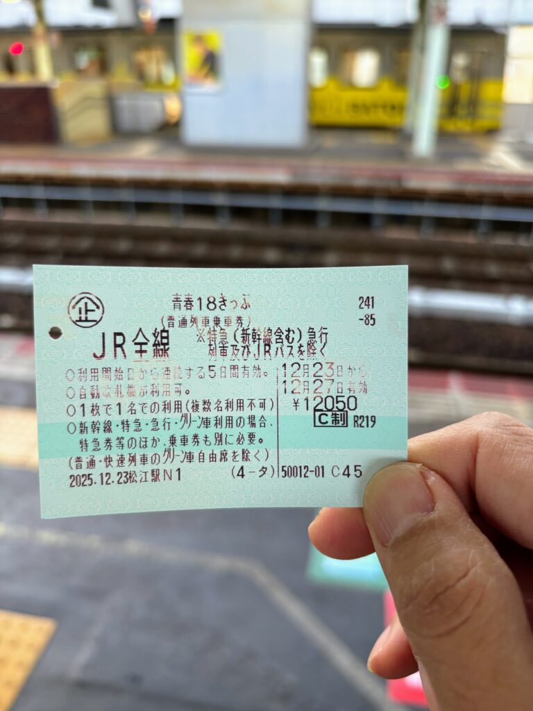 松江駅で、青春18きっぷ(5日間用)を購入。3日間用だと途中から新幹線で、5日間用だと東京まで普通列車で帰ることを意味しています。5日間用を購入することで、東京まで普通列車で帰ることを決断しました。価格は、3日間用は10,000円で、5日間用は12,050円です。価格差は小さいです。