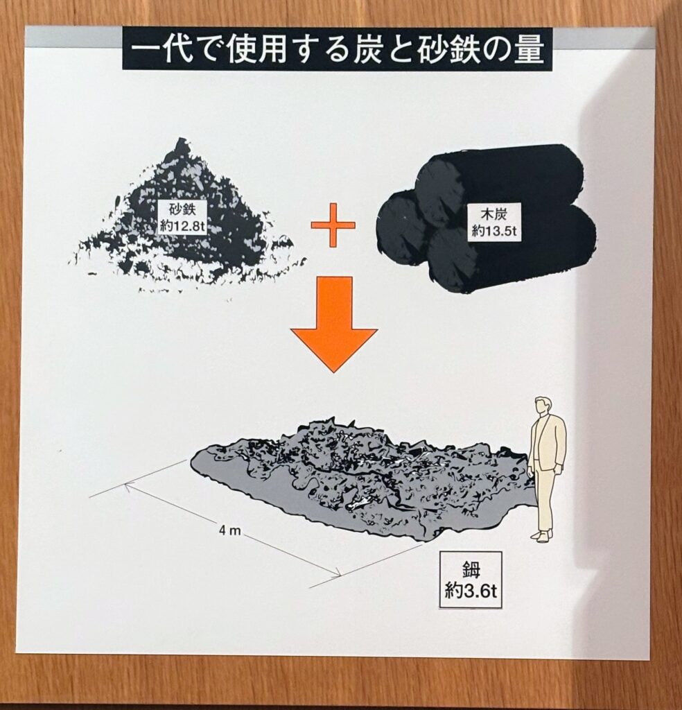 3日3晩のサイクルを一代というが、それに必要な原料は、「砂鉄12.8トン(土砂は1,000トン以上)と木炭13.5トン(森林面積1ヘクタール相当)」である。それで鉧が3.6トンできる。