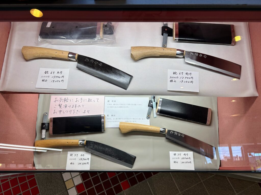 「和鋼博物館」には色々な刃物の売店があった。森で使うナタ。値段も違うけど、我々が使っているのを切れ味が違うのだろう。