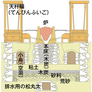「炉」の下には、湿気を避けるため、木炭や砂利が敷き詰められている。深さ4mにもおよぶ大仕掛けの地下構造である。一方、「炉」は粘土でできていて、毎回壊しては作り直す。