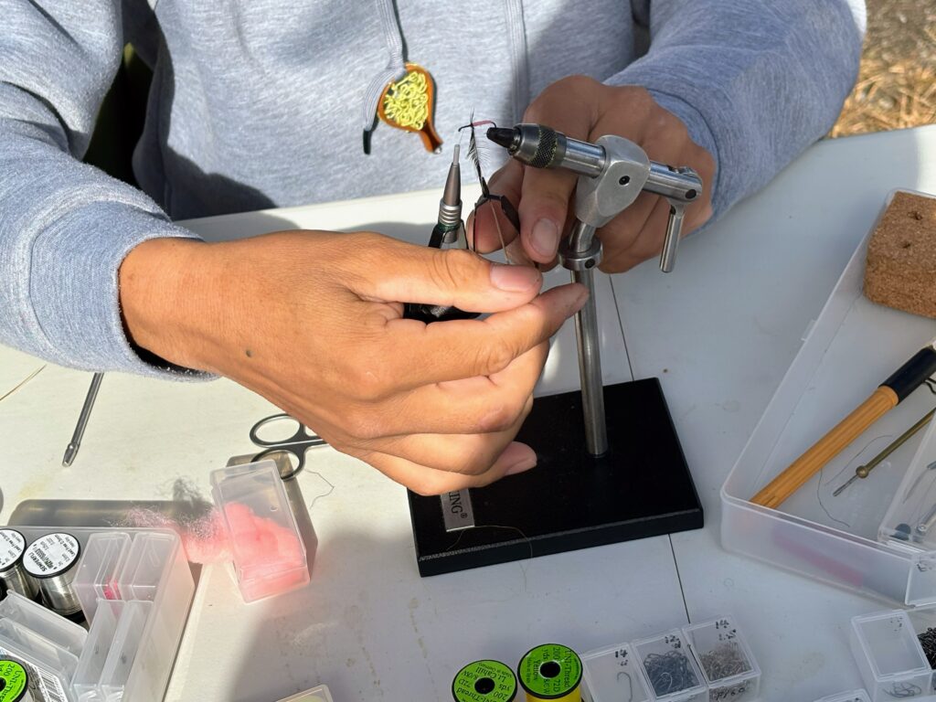 竿とライン、ラインとハリス、ハリスと毛鉤の結び方を教わる。釣り始めには、ラインのよりを戻すことが大切だと教わった。ラインを背中に回して思いっきり引っ張ってよりを戻すことを学んだ。しっかりよりを取ることが、キャストの精度に関わる。