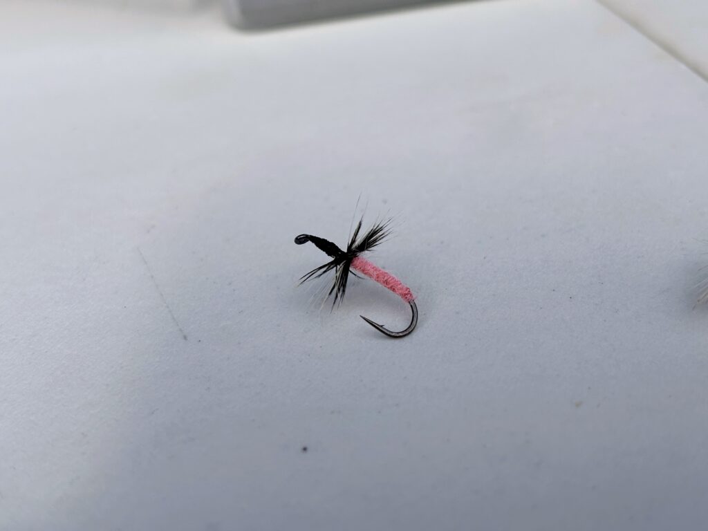上の写真は、J氏が一般的に使っている毛鉤。ピンク色が好みとのこと。一般的に釣れるのは、黒色の毛鉤と言われている。しかし、J氏はピンクが一番釣れているとのこと。色よりも毛鉤のシルエットが重要と言われていた。濁っている時は、黒色で大きめの毛鉤が有効であるとおしえてもっらった。