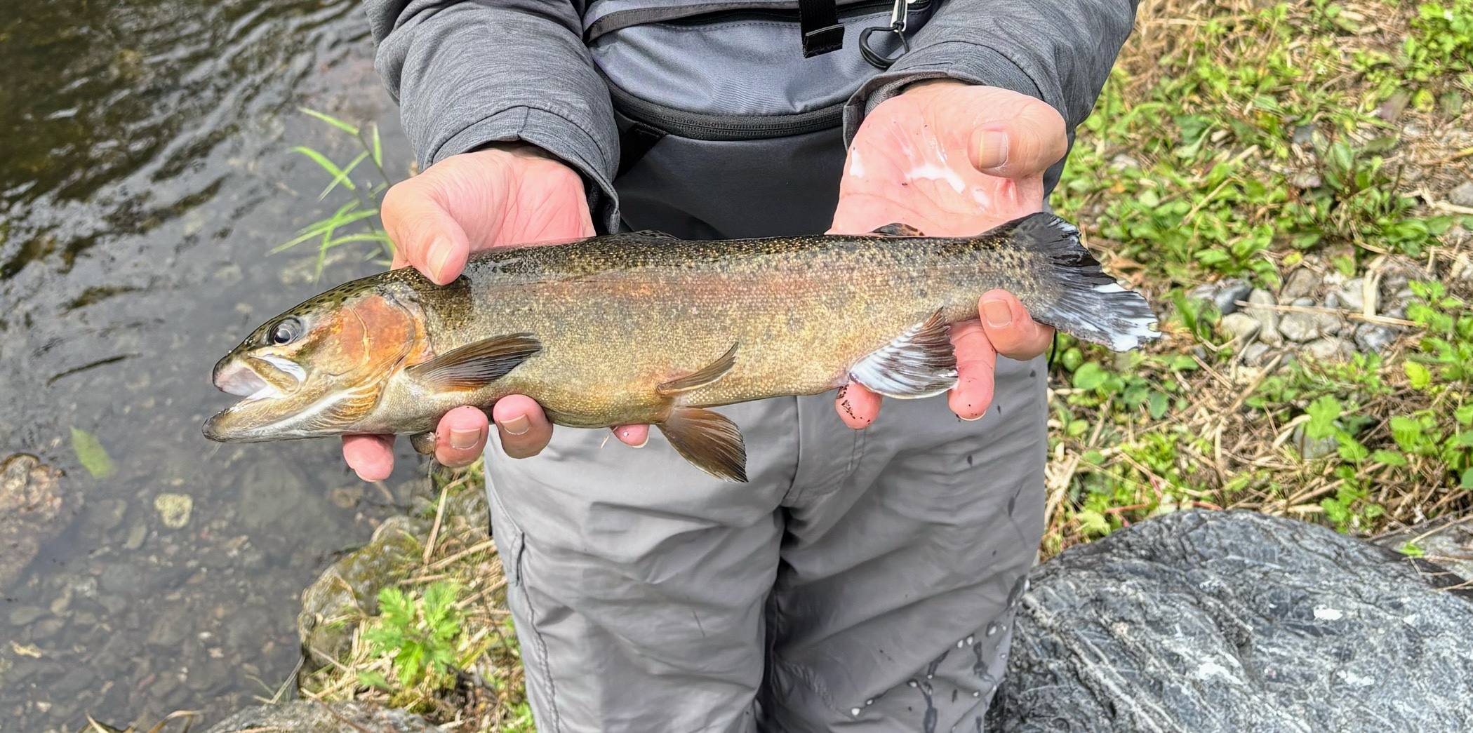 自分が釣ったニジマス。サイズは30cmくらいで、今まで釣った中で一番大きくて、引きが強かった。最初は何度かバラしてしまったが、いつか釣りたいと思っている尺イワナの練習になったはずである。